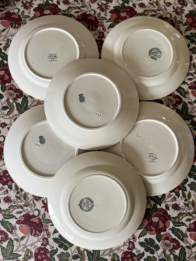 🇬🇧Set of 6 beautiful mismatched dinner plates from the finest French manufacturers: Creil & Montereau, Badonviller, H. Boulenger for le Grand Dépôt, stamped on the back