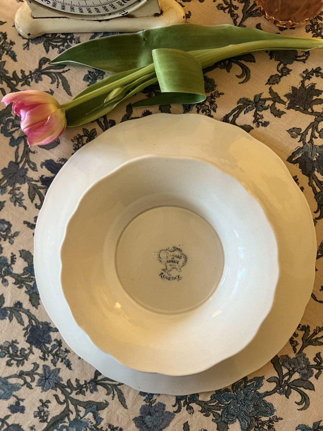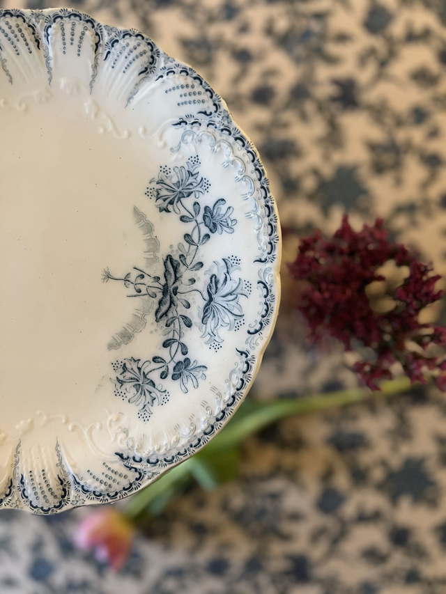 Superbe décor bleu-gris sur pâte blanche rehaussé par de subtils reliefs